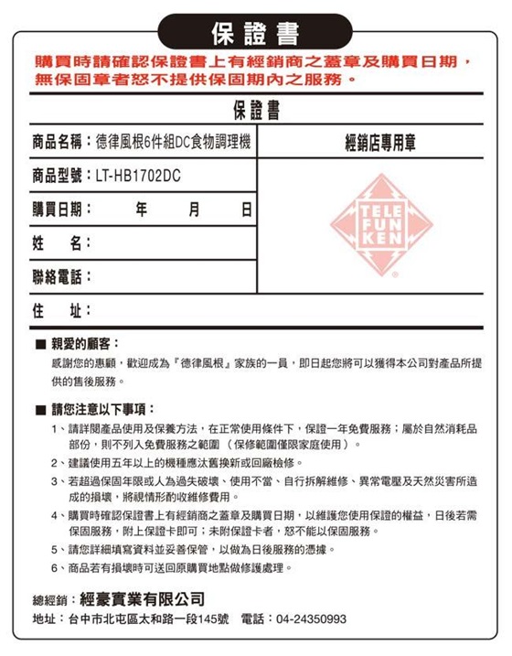平均每台最低只要1590元起(含運)即可享有【德律風根】六件組食物調理機(LT-HB1702DC)1台/2台,享保固1年,購買再加贈三箭牌保溫瓶。